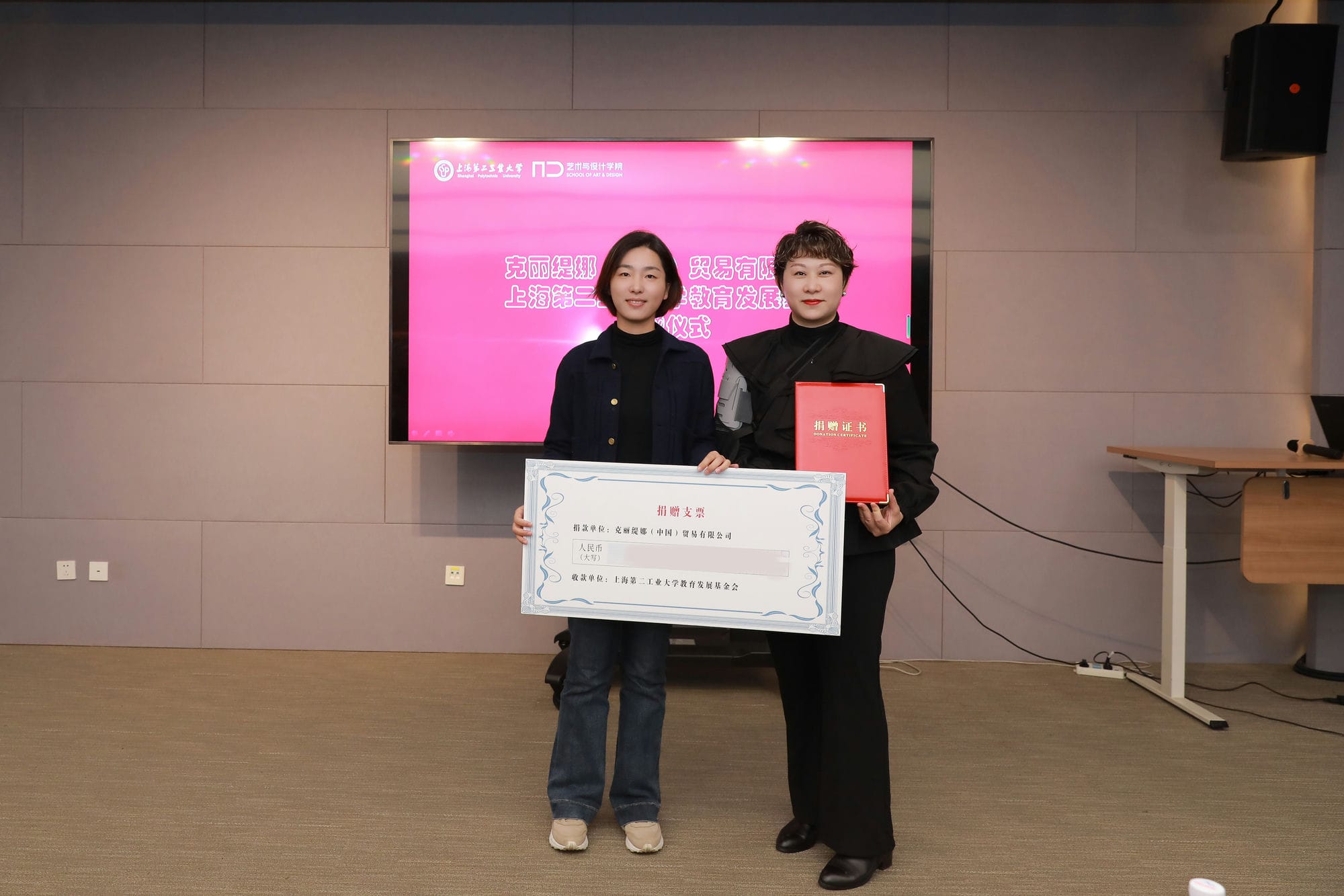 在仪式上,克丽缇娜向上海第二工业大学教育发展基金会捐赠专款,用于支持艺术与设计学院人物形象设计专业建设和人才培养。赵承佑先生表示,此次捐赠是克丽缇娜回馈社会、助力教育的重要举措,希望通过校企合作,为美业发展注入新的活力。